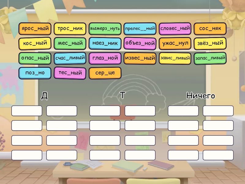 Д: звёз_ный, поз_но, сер_це, наез_ник, объез_ной, Т: мес_ный, извес_ный, кос_ный, счас_ливый, трос_ник, прелес__ный, ярос_ный, завис_ливый, Ничего: опас_ный, тес_ный, глаз_ной, сос_няк, словес_ный, ужас_нул, запас_ливый, вымерз_нуть,