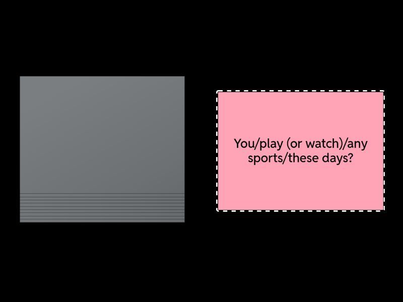 What/you/do? (job/occupation), What/you/do/at work (or school)/at the moment?, How often/you/go out with friends? , What/you/like/do?, What films/you/like/watch?, What/you/usually do/at the weekend?, You/read/a good book/at the moment?, You/play (or watch)/any sports/these days?, Why/you/study/English/this year?, You/do/any other courses/at the moment?, You/sleep well/at the moment?.