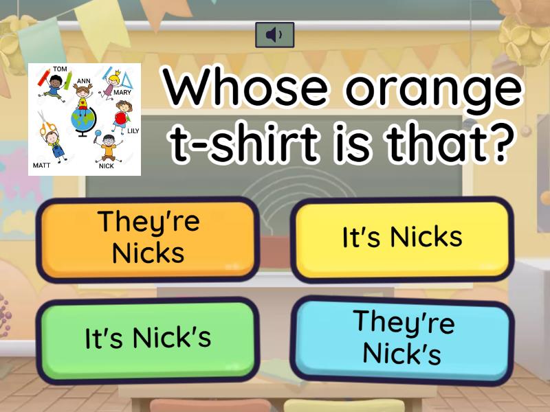 1) Whose red t-shirt is this? a) Its Ben's b) It's Lucy's c) It's Bens d) It's Ben's 2) Whose blue dress is this? a) Its Lucy's b) It's Ben's c) It's Lucy's d) It's Lucys 3) Whose pink shoes are those? a) They're Ben's b) They'r Lucy's c) They're Lucys d) They're Lucy's 4) Whose scissors are those? a) It's Matt's b) It's Mary's c) They're Matt's d) They're Nick's 5) Whose apple is that? a) They're Lilly's b) It's Matt's c) It's Nick's d) It's Lilly's 6) Whose rulers are those? a) It's Mary's b) It's Mary c) They're Mary d) They're Mary's 7) Whose pencils are those? a) They're Toms b) They Tom c) They're Tom's d) It's Toms 8) Whose orange t-shirt is that? a) They're Nick's b) It's Nicks c) They're Nicks d) It's Nick's 9) Whose green bag is that? a) It's Patricks b) It's Patrick's c) They're Patricks d) They're Patrick's 10) Whose black hat is that? a) It's Toms b) Its Toms c) Its Tom's d) It's Tom's