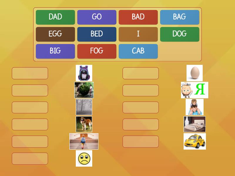 CAB, BAD, BAG, DAD, BED, EGG, DOG, FOG, GO, I, BIG,