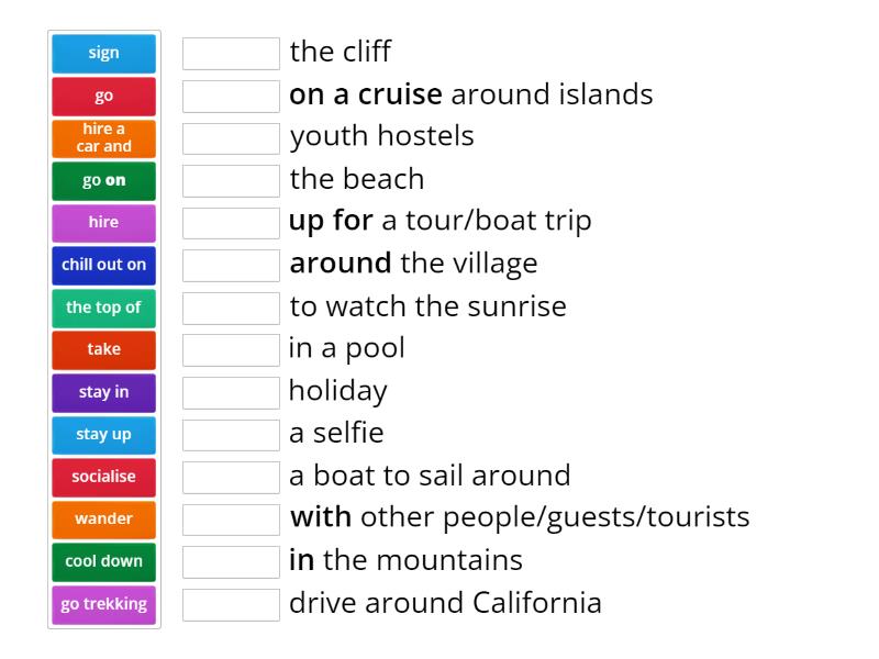 hire - a boat to sail around, wander - around the village, the top of - the cliff , take - a selfie, cool down - in a pool, stay up - to watch the sunrise, socialise - with other people/guests/tourists, sign - up for a tour/boat trip, go trekking - in the mountains, go on - holiday, hire a car and - drive around California, stay in - youth hostels, chill out on - the beach, go - on a cruise around islands,