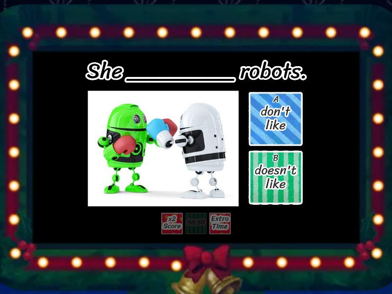 1) I __________ chocolate. a) like b) likes 2) I __________ candy. a) don't like b) doesn't like 3) He __________ balloons. a) like b) likes 4) He __________ nuts. a) don't like b) doesn't like 5) She __________ toys. a) like b) likes 6) She __________ robots. a) don't like b) doesn't like 7) Holly __________ balloons a) like b) likes 8) Billy __________ baby dinosaurs. a) don't like b) doesn't like