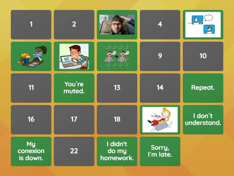 Sorry, I´m late., I didn't do my homework., You´re muted., My conexion is down., I don´t understand., Repeat., Read., Listen., Write., Your camera is frozen., Work in pairs., Work in groups.,