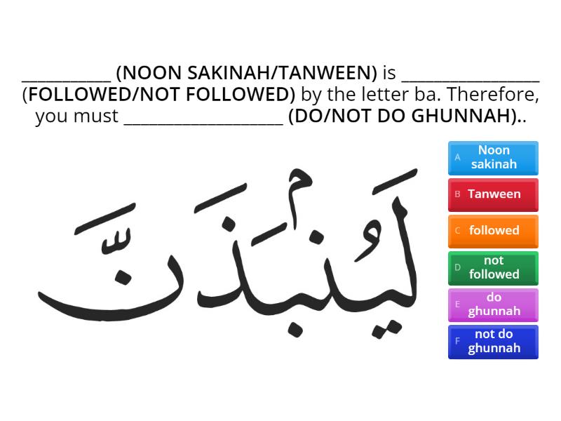 1) ___________ (NOON SAKINAH/TANWEEN) is _________________ (FOLLOWED/NOT FOLLOWED) by the letter ba. Therefore, you must ___________________ (DO/NOT DO GHUNNAH).. a) Noon sakinah b) Tanween c) followed d) not followed e) do ghunnah f) not do ghunnah 2) ___________ (NOON SAKINAH/TANWEEN) is _________________ (FOLLOWED/NOT FOLLOWED) by the letter ba. Therefore, you must ___________________ (DO/NOT DO GHUNNAH).. a) Noon sakinah b) Tanween c) followed d) not followed e) do ghunnah f) not do ghunnah 3) ___________ (NOON SAKINAH/TANWEEN) is _________________ (FOLLOWED/NOT FOLLOWED) by the letter ba. Therefore, you must ___________________ (DO/NOT DO GHUNNAH).. a) Noon sakinah b) Tanween c) followed d) not followed e) do ghunnah f) not do ghunnah 4) ___________ (NOON SAKINAH/TANWEEN) is _________________ (FOLLOWED/NOT FOLLOWED) by the letter ba. Therefore, you must ___________________ (DO/NOT DO GHUNNAH).. a) Noon sakinah b) Tanween c) followed d) not followed e) do ghunnah f) not do ghunnah 5) ___________ (NOON SAKINAH/TANWEEN) is _________________ (FOLLOWED/NOT FOLLOWED) by the letter ba. Therefore, you must ___________________ (DO/NOT DO GHUNNAH).. a) Noon sakinah b) Tanween c) followed d) not followed e) do ghunnah f) not do ghunnah 6) ___________ (NOON SAKINAH/TANWEEN) is _________________ (FOLLOWED/NOT FOLLOWED) by the letter ba. Therefore, you must ___________________ (DO/NOT DO GHUNNAH).. a) Noon sakinah b) Tanween c) followed d) not followed e) do ghunnah f) not do ghunnah 7) ___________ (NOON SAKINAH/TANWEEN) is _________________ (FOLLOWED/NOT FOLLOWED) by the letter ba. Therefore, you must ___________________ (DO/NOT DO GHUNNAH).. a) Noon sakinah b) Tanween c) followed d) not followed e) do ghunnah f) not do ghunnah 8) ___________ (NOON SAKINAH/TANWEEN) is _________________ (FOLLOWED/NOT FOLLOWED) by the letter ba. Therefore, you must ___________________ (DO/NOT DO GHUNNAH). a) Noon sakinah b) Tanween c) followed d) not followed e) do ghunnah f) not do ghunnah 9) ___________ (NOON SAKINAH/TANWEEN) is _________________ (FOLLOWED/NOT FOLLOWED) by the letter Baa. Therefore, you must ___________________ (WITH/WITHOUT GHUNNAH). a) Noon sakinah b) Tanween c) followed d) not followed e) with ghunnah f) without ghunnah 10) ___________ (NOON SAKINAH/TANWEEN) is _________________ (FOLLOWED/NOT FOLLOWED) by the letter Baa. You must read it ___________________ (WITH/WITHOUT GHUNNAH). a) Noon sakinah b) Tanween c) followed d) not followed e) with ghunnah f) without ghunnah