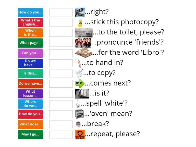 What's the English... - ...for the word 'Libro'?, How do you.. - ...pronounce 'friends'?, How do you... - ...spell 'white'?, What lesson... - ...comes next?, May I go... - ...to the toilet, please?, What does... - ...'oven' mean?, Can you... - ...repeat, please?, When is the... - ...break?, Is this... - ...right?, Do we have.... - ...to copy?, Where do we... - ...stick this photocopy?, Do we have... - ...to hand in?, What page... - ...is it?,