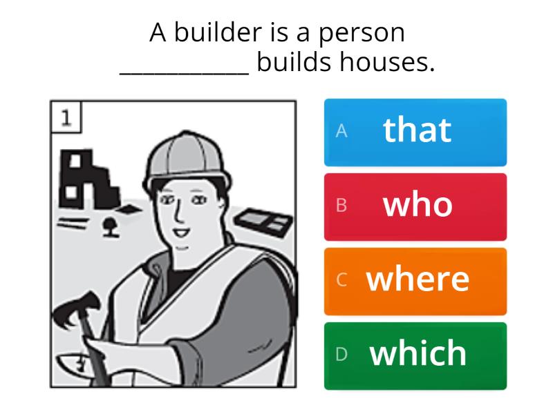1) A builder is a person ___________ builds houses. a) that b) who c) where d) which 2) A hairstylist is somebody ___________ cuts your hair. a) that b) who c) where d) which 3) A library is a place _________ you can read or borrow books. a) who b) where c) that d) which 4) A camping is a place __________ people sleep in tents. a) that b) where c) who d) which 5) An architect is someone __________ designs buildings. a) where b) that c) who d) which 6) An internet cafe is a place ________ you can send emails and drink coffee. a) where b) who c) that d) which 7) An art gallery is a place ________ you see sculptures and paintings. a) who b) that c) where d) which 8) Sneakers are shoes __________ people wear for sports. a) where b) who c) that d) which 9) A bookstore is a place __________ you can buy books. a) who b) where c) that d) which 10) Scissors are things __________ you use to cut paper. a) that b) who c) which d) where 11) A lipstick is something ________ you put on your lips. a) which b) that c) where d) who 12) A pilot is a person __________ flies planes. a) who b) that c) where d) which 13) A tourist is a person ___________ visits another country. a) which b) who c) that d) where