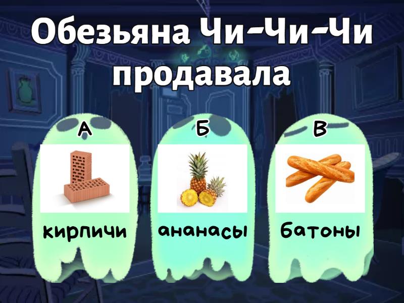 1) Обезьяна Чи-Чи-Чи продавала a) кирпичи b) ананасы c) батоны 2) Чо-чо-чо — левое a) мяч b) плечо c) рука 3) Чи-чи-чи — новые a) учебники b) штаны c) ключи 4) Ач-ач-ач — у Никиты a) мяч b) чипсы c) кулич 5) Оч-оч-оч — вот у мамы a) ночь b) дочь c) сын 6) Уч-уч-уч — виден яркий a) ключ b) луч c) мяч 7) Еч-еч-еч — вот огромный a) меч b) печь c) кирпич