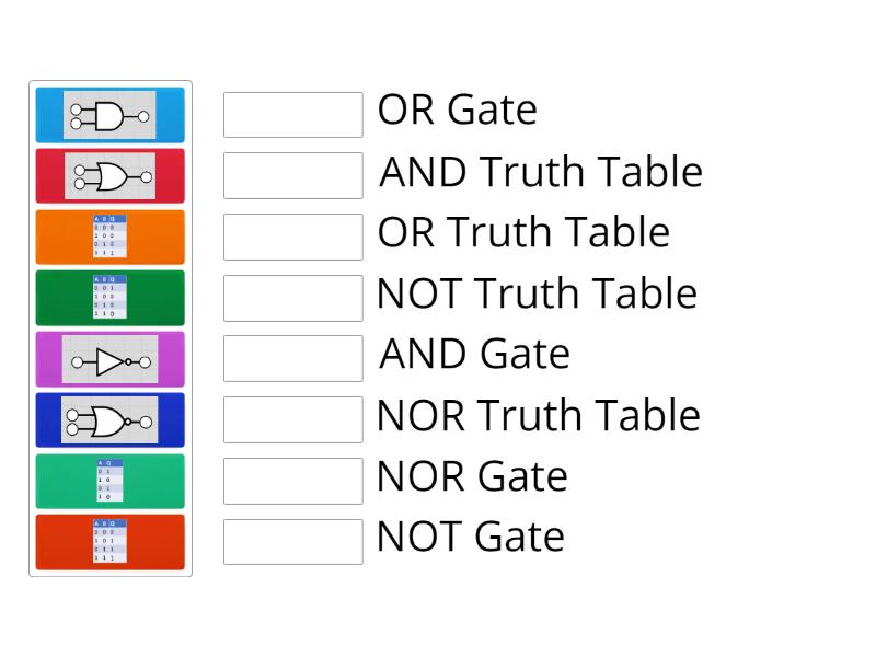 AND Truth Table, AND Gate, NOR Truth Table, NOR Gate, NOT Truth Table, NOT Gate, OR Truth Table, OR Gate,
