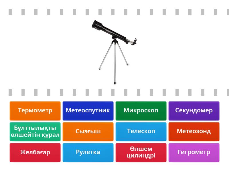 Телескоп, Желбағар, Термометр, Микроскоп, Гигрометр, Метеоспутник, Бұлттылықты өлшейтін құрал, Метеозонд, Секундомер, Рулетка, Өлшем цилиндрі, Сызғыш,