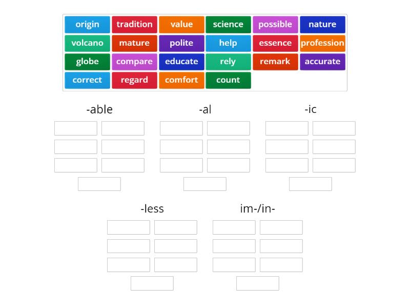 -able: comfort, remark, rely, value, compare, -al: globe, educate, nature, tradition, origin, profession, essence, -ic: volcano, science, -less: count, help, regard, im-/in-: possible, polite, mature, correct, accurate,
