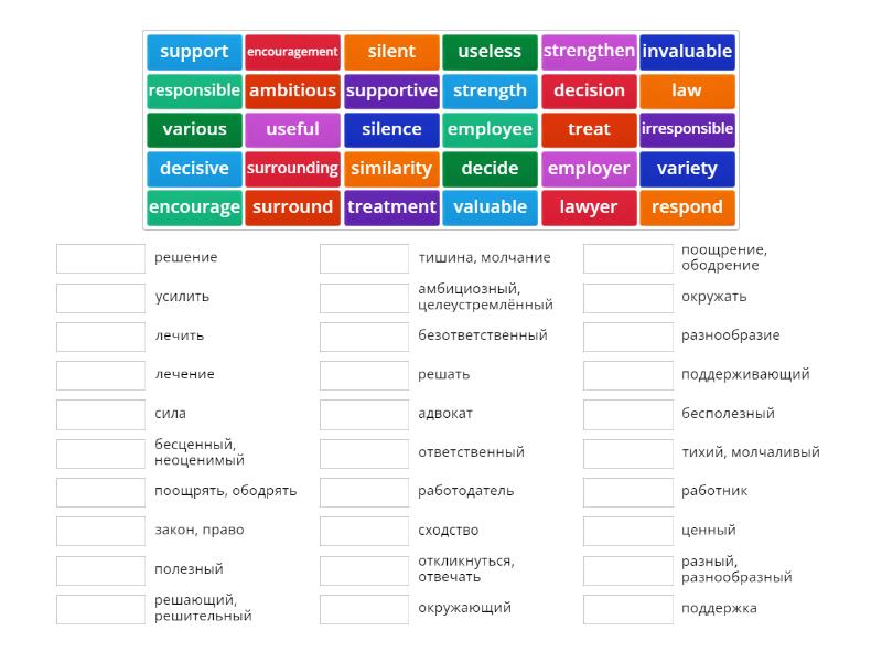 similarity - сходство, various - разный, разнообразный, variety - разнообразие, treat - лечить, treatment - лечение, silence - тишина, молчание, silent - тихий, молчаливый, respond - откликнуться, отвечать, responsible - ответственный, irresponsible - безответственный, law - закон, право, lawyer - адвокат, decide - решать, decision - решение, decisive - решающий, решительный, support - поддержка, supportive - поддерживающий, surround - окружать, surrounding - окружающий, valuable - ценный, invaluable - бесценный, неоценимый, useful - полезный, useless - бесполезный, employer - работодатель, employee - работник, ambitious - амбициозный, целеустремлённый, strength - сила, strengthen - усилить, encourage - поощрять, ободрять, encouragement - поощрение, ободрение,