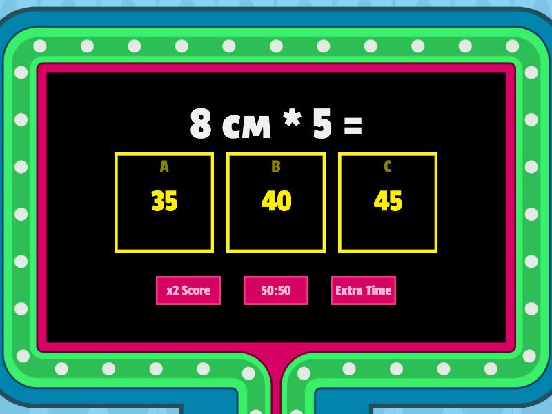 1) 8 см * 5 = a) 35 b) 40 c) 45 2) 40 см : 5 = a) 6 b) 4 c) 8 3) 6 л * 4 = a) 36 b) 24 c) 42 4) 21кг : 7 = a) 4 b) 3 c) 5 5) 7кг * 3 = a) 14 b) 21 c) 28