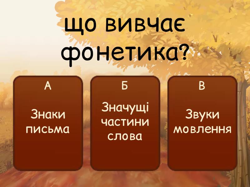 1) що вивчає фонетика? a) Знаки письма b) Значущі частини слова c) Звуки мовлення 2) Як називаєтья найменша одиниця мови та мовлення? a) Склад b) Звук c) Слово 3) Скільки звуків в українській мові? a) 33 b) 35 c) 38 4) Скільки в українській мові голосних звуків a) 9 b) 11 c) 6 5) Як називаються приголосні звуки які утворюються з голосу і шуму? a) Дзвінкі b) глухі c) шиплячі 6) приголосні звуки які утворюються тільки із шуму називаються a) глухі b) губні c) дзвінкі 7) Частина слова яку вимовляють одним поштовхом видихуваного повітря a) наголос b) звук c) склад