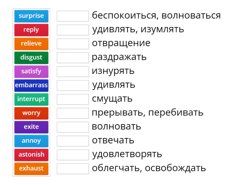 annoy - раздражать, disgust - отвращение, astonish - удивлять, изумлять, exite - волновать, worry - беспокоиться, волноваться, exhaust - изнурять, relieve - облегчать, освобождать, satisfy - удовлетворять, surprise - удивлять, embarrass - смущать, reply - отвечать, interrupt - прерывать, перебивать,