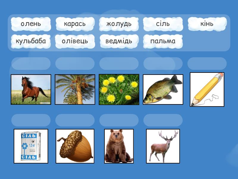 олівець, сіль, олень, кінь, пальма, ведмідь, карась, кульбаба, жолудь,