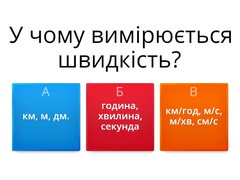 1) У чому вимірюється швидкість? a) км, м, дм. b) година, хвилина, секунда c) км/год, м/c, м/хв, см/с 2) Вибери правильний запис формули шляху a) S = t : v b) S = v : t c) S = v * t 3) Знайди відстань між селами, якщо відомо, що мотоцикліст проїхав його за 2 години зі швидкістю 40 км / год. a) 80 км/год b) 80 км c) 20 км d) 0 км0 4) За який час проїде автобус відстань 240 км, якщо буде рухатися зі швидкістю 60 км / год? a) 4 год b) 40 хв c) 4 хв 5) Швидкість поїзда 60 км / год. Яка відстань поїзд проїде за 4 години? a) 15 км b) 240 км c) 240 км/год d) 15 км/год 6) Відстань між будинком і магазином 640 м. Хлопчик пройшов його за 8 хв. Чому дорівнює швидкість хлопчика? a) 8 м b) 55 м c) 80 м/хв 7) Яке слово пропущене? Щоб знайти швидкість, треба відстань ... на час a) збільшити b) помножити c) розділити 8) Яке слово пропущене? Щоб знайти час, треба відстань ... на швидкість. a) збільшити b) помножити c) розділити 9) Яке слово пропущене? Щоб знайти відстань, треба швидкість ... на час a) розділити b) збільшити c) помножити 10) Туристи рухались 5 годин із щвидкістю 15 км/год. Який шлях вони пройшли за цей час? a) 75 км b) 3 км c) 5 км 11) Пішохід за 4 години пройшов 16 км. З якою швидкістю рухався пішохід? a) 4 км b) 12 км c) 4 км/ год d) 64 км/год