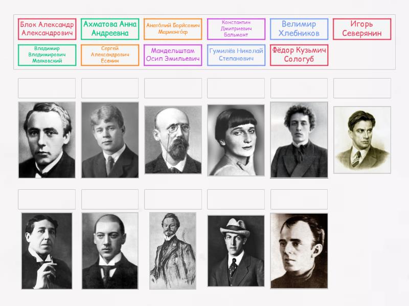 Ахматова Анна Андреевна, Блок Александр Александрович, Гумилёв Николай Степанович, Мандельштам Осип Эмильевич , Фёдор Кузьмич Сологуб, Константин Дмитриевич Бальмонт, Сергей Александрович Есенин, Владимир Владимирович Маяковский, Игорь Северянин, Велимир Хлебников, Анато́лий Бори́сович Мариенго́ф,