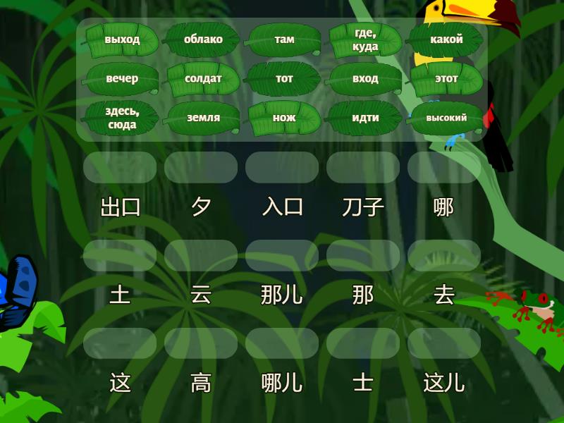 высокий - 高, нож - 刀子, этот - 这, здесь, сюда - 这儿, тот - 那, там - 那儿, какой - 哪, где, куда - 哪儿, вечер - 夕, солдат - 士, земля - 土, вход - 入口, идти - 去, выход - 出口, облако - 云,