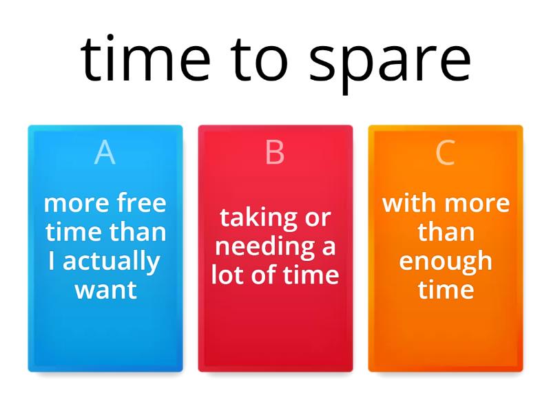 1) time to spare a) more free time than I actually want b) taking or needing a lot of time c) with more than enough time 2) time’s up a) the time for sth has expired b) when a person who is normally very busy relaxes or does sth they enjoy c) for the moment 3) short of time a) don't have enough time b) the time for sth has expired c) time remaining 4) time on my hands a) it’s inevitable that sth will happen b) more free time than I actually want c) used to say that sth should have happened before now 5) for the time being a) time remaining b) more free time than I actually want c) for the moment 6) it’s a matter of time a) more free time than I actually want b) it’s inevitable that sth will happen c) with more than enough time 7) me time a) more free time than I actually want b) the time for sth has expired c) when a person who is normally very busy relaxes or does sth they enjoy 8) time left a) don't have enough time b) time remaining c) taking or needing a lot of time 9) about time a) used to say that sth should have happened before now b) for the moment c) it’s inevitable that sth will happen 10) time-consuming a) with more than enough time b) more free time than I actually want c) taking or needing a lot of time