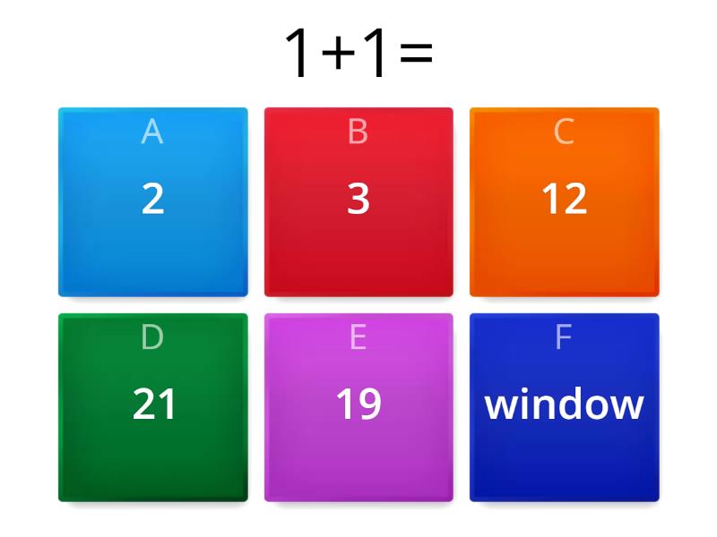 1) 1+1= a) 2 b) 3 c) 12 d) 21 e) 19 f) window 2) 2+985762945 a) 985762947 b) 985762943 c) 985762941 d) 985762949 e) 985762946 f) 985762944 3) 21X21+21-21%21 a) 1 b) 2 c) 3 d) 6 e) 4 f) 5