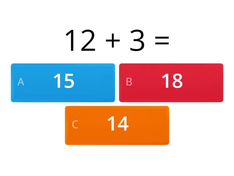 1) 12 + 3 = a) 15 b) 18 c) 14 2) Број 11 увећај за број 6. Израчунај збир. a) 18 b) 19 c) 17 3) Први сабирак је 7, а други сабирак је 12. Израчунај збир a) 16 b) 19 c) 18 4) Број 13 увећај за следбеник броја 4. Израчунај збир. a) 19 b) 17 c) 18 5) Милан има 12 година. Његов брат је 4 године старији. Колико година има Миланов брат? a) 16 b) 17 c) 18