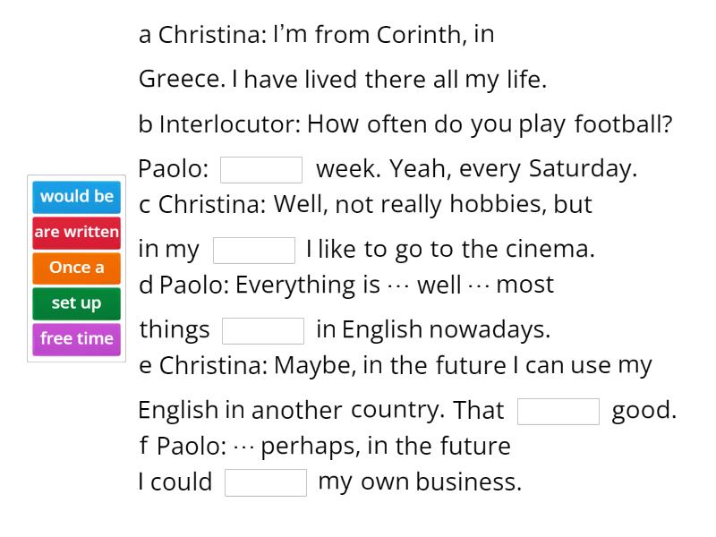 a Christina: I’m from Corinth, in Greece. I have lived there all my life. b Interlocutor: How often do you play football? Paolo: ____ week. Yeah, every Saturday. c Christina: Well, not really hobbies, but in my ____ I like to go to the cinema. d Paolo: Everything is … well … most things ____ in English nowadays. e Christina: Maybe, in the future I can use my English in another country. That ____ good. f Paolo: … perhaps, in the future I could ____ my own business.