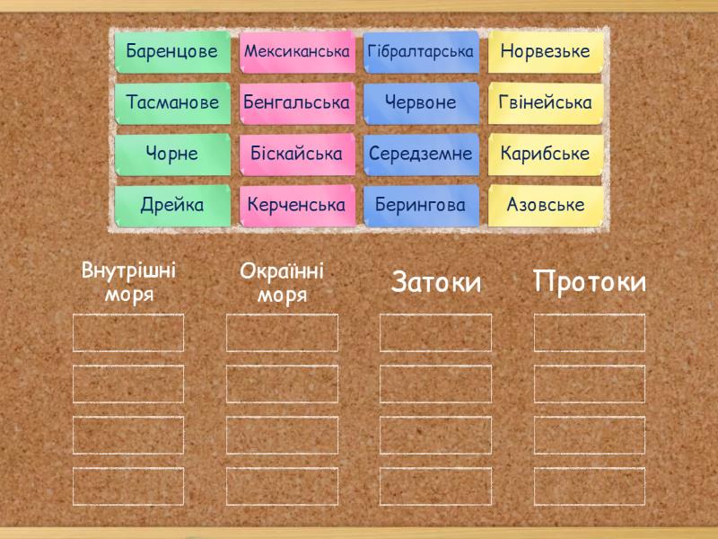 Внутрішні моря: Середземне, Чорне, Азовське, Червоне, Окраїнні моря: Баренцове, Тасманове, Карибське, Норвезьке, Затоки: Біскайська, Бенгальська, Мексиканська, Гвінейська, Протоки: Керченська, Дрейка, Гібралтарська, Берингова,