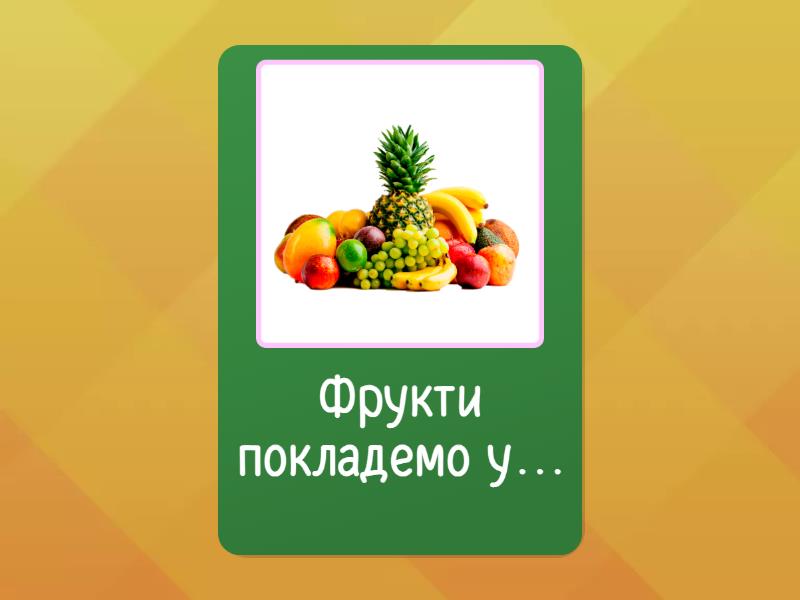 Хліб покладемо у... - ...хлібницю, Цукор покладемо у... - ...цукорницю, Сіль покладемо у... - ...сільничку, Лимон покладемо у... - ...лимонницю, Масло покладемо у... - ...маслянку, Оселедець покладемо у... - ...оселедницю, Перець покладемо у... - ...перечницю, Салат покладемо у... - ...салатницю, Соус покладемо у... - ...соусницю, Торт покладемо у... - ...тортівницю, Фрукти покладемо у... - ...фруктовницю, Цукерки покладемо у... - ...цукерницю, Суп насиплемо із... - ...супниці, Чай наллємо із... - ...чайника,