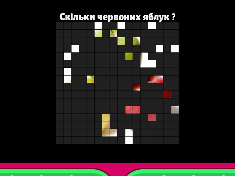 1) Скiльки червоних яблук ? a) 1 b) 2 c) 3 2) Скiльки яблук ? a) 1 b) 2 c) 3 3) Скiльки собак? a) 2 b) 5 c) 6 4) Скiльки олiвцiв? a) 6 b) 5 c) 4 5) Скiльки стiльцiв? a) 7 b) 4 c) 5 6) Скiльки сiрих стiльцiв? a) 1 b) 3 c) 4 7) Скiльки акул? a) 2 b) 3 c) 1