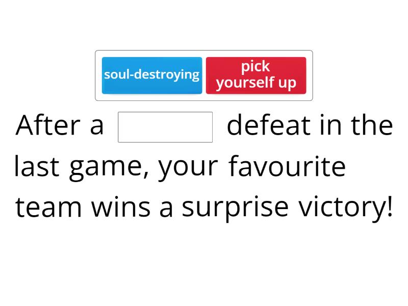 After a ____ defeat in the last game, your favourite team wins a surprise victory! Your little café is losing money, so you decide to ____and sell up. You ____ after a disappointment. You ____ and try a new hobby. You see your dream job advertised, so you ____! You ____ and get a pop-up shop for your new retail idea. You ____ with your investments and you see very little growth. You make a joke which ____. Your boss asks you to ____ on a project. You’re ____ to keep your house tidy. Your favourite band ____.