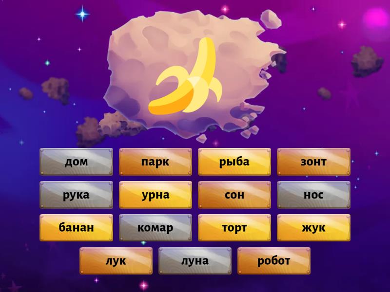 банан, луна, зонт, жук, нос, сон, рыба, рука, робот, урна, комар, парк, торт, дом, лук,