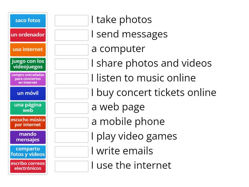 uso internet - I use the internet, juego con los videojuegos - I play video games, escucho música por internet - I listen to music online, compro entradadas para conciertos en internet - I buy concert tickets online, escribo correos electrónicos - I write emails, mando mensajes - I send messages, saco fotos - I take photos, comparto fotos y videos - I share photos and videos, un ordenador - a computer, una página web - a web page, un móvil - a mobile phone,
