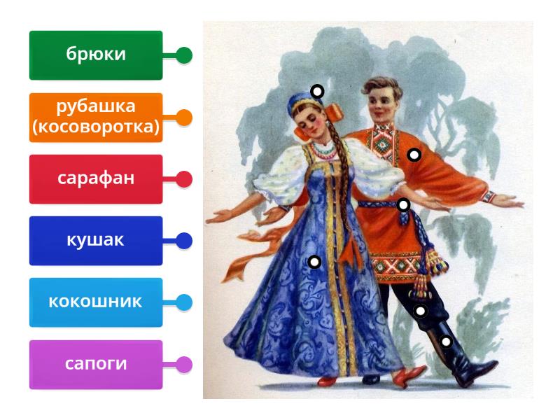 кокошник, сарафан, рубашка (косоворотка), брюки, сапоги, кушак.