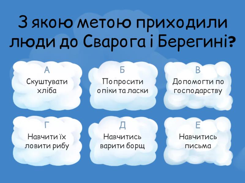 1) З якою метою приходили люди до Сварога і Берегині? a) Скуштувати хліба b) Попросити опіки та ласки c) Допомогти по господарству d) Навчити їх ловити рибу e) Навчитись варити борщ f) Навчитись письма 2) Хто змайстрував для Берегині ткацький верстат? a) Перун b) Дажбог c) Род d) Сварог e) Ярило f) Білобог 3) Що відбувалось, коли лютував Чорнобог? a) Затемнення Сонця b) Земля тряслась і гойдалась c) Три дні йшов дощ d) Посуха e) З неба падало каміння f) Всі плазуни ховались в нори 4) У яку річку Берегиня загнала ящерів? a) Дніпро b) Супій c) Дунай d) Рось e) Дністер f) Ворскла 5) Хто перетворив ящерів у скелі? a) Білобог b) Берегиня c) Род d) Сварог e) Нептун f) Перун 6) Хто в українців став богинею та захисницею Краси , Білої Хати? a) Берегиня b) Мара c) Мавка d) Лада e) Матір Божа f) Княгиня Ольга 7) Як вишивали Берегиню? a) Тільки червоними нитками b) З піднятими дороги руками c) З хлібиною в руках d) З довгим волоссям e) З мечем у правій руці f) Із заплетеним волоссям 8) Які знання отримали люди від Сварога і Берегині? a) Як будувати хати, хліб пекти , полотно ткати b) Як будувати човни та ловити рибу c) Як заплітати косу d) Як будувати хати, хліб пекти , худобу розводити e) Як молитися богам f) Як рахувати до 100 9) Хто був спільницею Чорнобога? a) Мара b) Баба Яга c) Відьма d) Мавка e) Черниця f) Ворожка 10) Хто кидав у ящерів запалені смолоскипи? a) Сварог b) Перун c) Дажбог d) Ярило e) Род f) Велес 11) Хто змусив ящерів відступити? a) Берегиня b) Перун c) Чорнобог d) Білобог e) Найбільший ящер f) Кентавр 12) Чиї стріли були вишиті на одязі Берегині? a) Перуна b) Рода c) Дажбога d) Христа e) Білобога f) Чорнобога