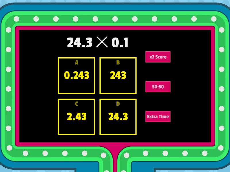 1) 24.3 ✕ 0.1 a) 0.243 b) 243 c) 2.43 d) 24.3 2) 24.3 ✕ 0.01 a) 243 b) 0.243 c) 2.43 d) 24.3 3) 24.3 ✕ 0.001 a) 243 b) 0.0243 c) 0.243 d) 2430 4) 24.3 ✕ 10 a) 2430 b) 24.3 c) 2.43 d) 243 5) 24.3 ✕ 100 a) 0.243 b) 2430 c) 24.3 d) 2.43 6) 24.3 ✕ 1000 a) 2430 b) 24300 c) 243 d) 0.0243 7) 24.3 ✕ 1 a) 24.3 b) 2.43 c) 2430 d) 0.243 8) 5.2✕ 100 a) 5.2 b) 52 c) 5200 d) 520 9) 3.8✕ 0.1 a) 3.8 b) 38 c) 0.038 d) 0.38 10) 670✕ 0.01 a) 0.67 b) 0.067 c) 67 d) 6.7 11) 0.025✕ 1000 a) 0.25 b) 2.5 c) 25 d) 250 12) 4.99✕ 100 a) 499 b) 4.99 c) 49.9 d) 4990 13) 11✕ 0.9 a) 9.9 b) 2.5 c) 25 d) 99 14) 8✕ 0.06 a) 5.4 b) 0.54 c) 4.8 d) 0.48 15) 50✕ 0.08 a) 400 b) 40 c) 4 d) 0.4