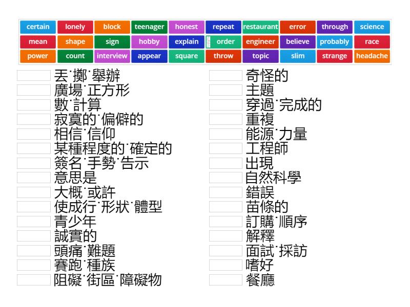order - 訂購˙順序, believe - 相信˙信仰, through - 穿過˙完成的, mean - 意思是, interview - 面試˙採訪, restaurant - 餐廳, explain - 解釋, repeat - 重複, hobby - 嗜好, power - 能源˙力量, lonely - 寂寞的˙偏僻的, certain - 某種程度的˙確定的, appear - 出現, block - 阻礙˙街區˙障礙物, error - 錯誤, science - 自然科學, teenager - 青少年, headache - 頭痛˙難題, shape - 使成行˙形狀˙體型, count - 數˙計算, race - 賽跑˙種族, slim - 苗條的, topic - 主題, sign - 簽名˙手勢˙告示, throw - 丟˙擲˙舉辦, square - 廣場˙正方形, strange - 奇怪的, honest - 誠實的, probably - 大概˙或許, engineer - 工程師,