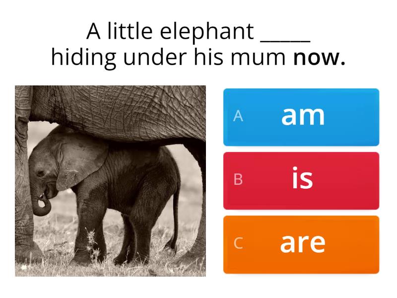 1) A little elephant _____ hiding under his mum now. a) am b) is c) are 2) A red cat _____ sitting on the swing at the moment. a) am b) is c) are 3) They ____ fishing now. a) am b) is c) are 4) The boys _____ jumping now. a) am b) is c) are 5) You _____ taking a photo at the moment. a) am b) is c) are 6) A monkey _____ climbing the tree now. a) am b) is c) are 7) We ______ going by train now. a) am b) is c) are 8) I ____ climbing the tree now. a) am b) is c) are 9) A lion ____ drinking water. a) am b) is c) are 10) The birds ______ walking on the grass. a) am not b) isn't c) aren't 11) It ____ raining at the moment. a) am b) is c) are 12) A bird ____ feeding a little kitten. a) am not b) isn't c) aren't 13) A man _____ riding a horse at the moment. a) am b) is c) are 14) The chicks _______ hiding now. a) am b) is c) are 15) I _____ riding a scooter. a) 'm b) 's c) 're