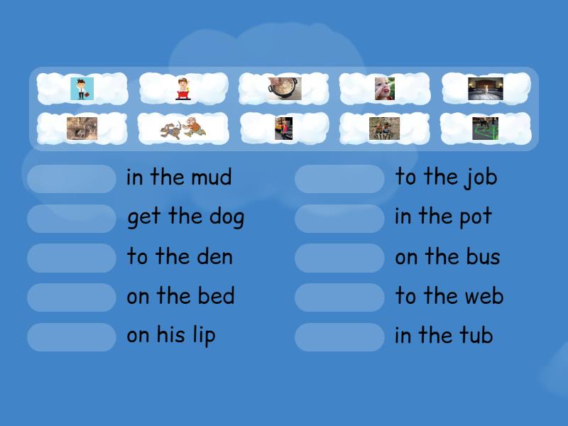 to the den, on the bed, in the mud, to the web, to the job, on the bus, in the tub, on his lip, in the pot, get the dog,