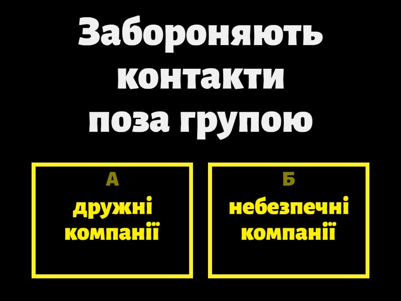 1) Компанії бувають a) спільні b) дружні c) небезпечні d) нетривалі 2) Приймають вас такими, які ви є a) дружні компанії b) небезпечні компанії 3) Забороняють контакти поза групою a) дружні компанії b) небезпечні компанії 4) Команда - це a) група людей, яка має спільні теми для обговорення b) група людей, яка працює для досягнення спільної мети c) група людей, яка разом проводить вільний час 5) Щоб робота в команді була ефективною a) її учасники мають допомагати один одному b) необов язково дослухатись до думки інших c) ставити запитання d) вільно висловлювати думки e) варто завжди погоджуватись з думкою інших f) пропонувати ідеї 6) У дружньому класі a) можна не говорити "дякую" b) сваряться c) не говорять по черзі d) грубіянять e) не дражняться f) можна не ділитися 7) Робота в команді - це a) можливість "командувати" людьми b) творча атмосфера для цікавих ідей c) необов язкове внесення своїх ідей d) розвиток згуртованості, дружніх стосунків 8) Продовжіть речення: "Скажи мені, хто твій друг, і я скажу, ..." a) хто твій сусід b) хто ти c) хто твій ворог d) який він