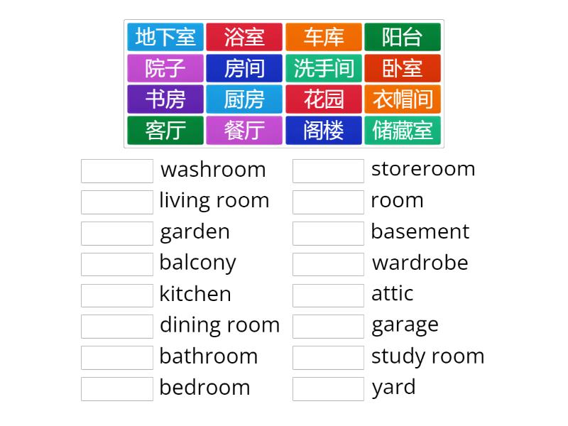 书房 - study room, 车库 - garage, 地下室 - basement, 衣帽间 - wardrobe , 阳台 - balcony, 卧室 - bedroom, 房间 - room, 花园 - garden, 客厅 - living room, 洗手间 - washroom, 阁楼 - attic, 浴室 - bathroom, 院子 - yard, 储藏室 - storeroom, 厨房 - kitchen, 餐厅 - dining room,