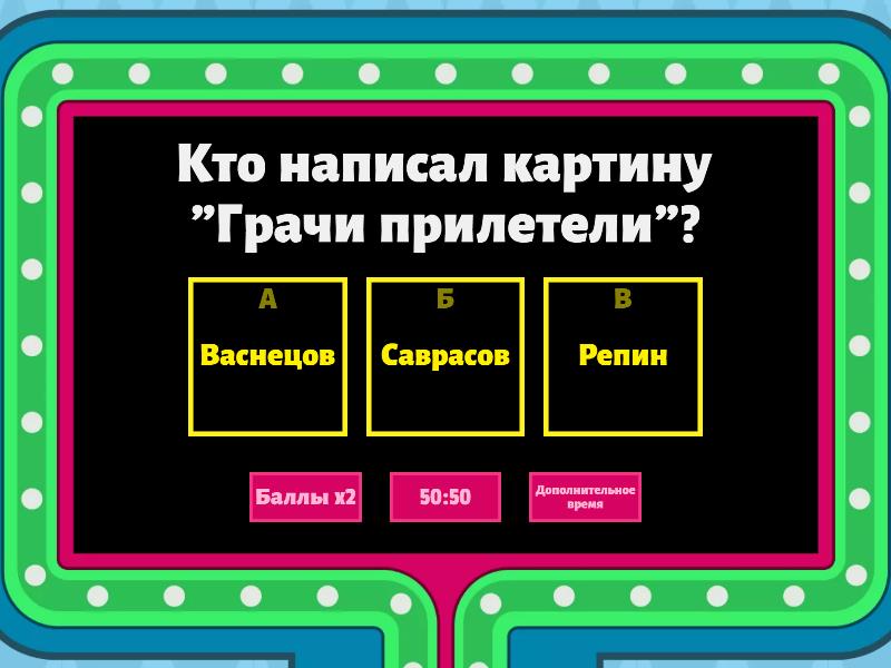 1) Кто написал картину "Грачи прилетели"? a) Васнецов b) Саврасов c) Репин 2) Какая планета Солнечной системы ближайшая к Солнцу? a) Меркурий b) Марс c) Венера 3) В каком году закончилась первая Мировая война? a) 1916 b) 1918 c) 1914 4) Как в лото называется число "22"? a) воробушки b) курочки c) уточки 5) Сколько дней в високосном году? a) 366 b) 365 c) 364