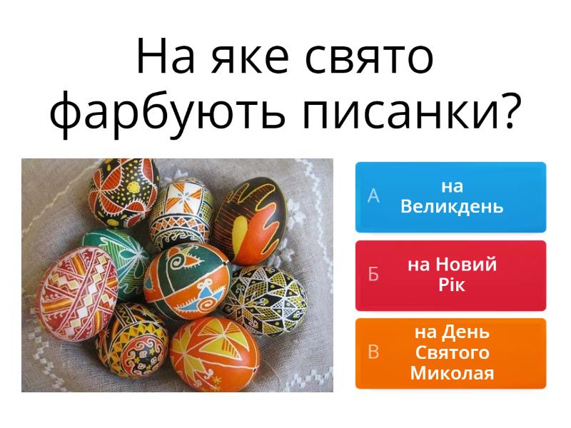 1) На яке свято фарбують писанки? a) на Великдень b) на Новий Рік c) на День Святого Миколая 2) Який інструмент використовують для розпису писанки? a) b) c) 3) Вкажи вид писанки a) Мальованка b) Дряпанка c) Крапанка 4) Вкажи вид писанки a) Крапанка b) Дряпанка c) Мальованка 5) Вкажи вид писанки a) Мальованка b) Дряпанка c) Крапанка 6) Вибери назву символа, який зображений на малюнку a) Дубовий листок b) Каштановий листок c) Березовий листок 7) Вибери назву символа, який зображений на малюнку a) Сонце b) Баранячі ріжки c) Пташка 8) Вибери назву символа, який зображений на малюнку a) Сонце b) Зірка c) Місяць 9) Вибери, що ти покладеш у Великодній кошик? a) b) c) d)