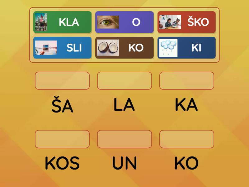 KLA - UN, KO - KOS, O - KO, KI - ŠA, ŠKO - LA, SLI - KA,