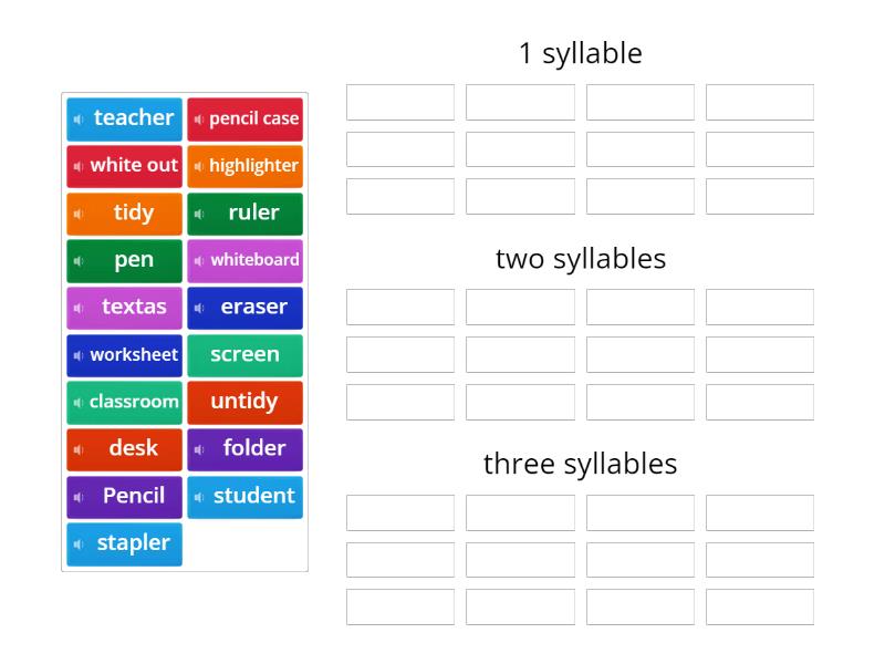 1 syllable : pen, screen, desk, two syllables : whiteboard, student, teacher, ruler, white out , stapler , worksheet, textas, classroom, tidy, folder , Pencil , three syllables: eraser, pencil case , highlighter, untidy,