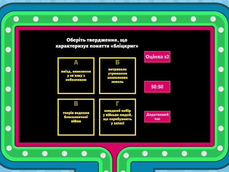 1) Оберіть твердження, що характеризує поняття «бліцкриг» a) виїзд, вивезення у зв’язку з небезпекою b) нетривале утримання захоплених земель c) теорія ведення блискавичної війни d) швидкий набір у військо людей, що перебувають у запасі 2) У чому полягала суть наказу «Ні кроку назад!»? a) швидка перебудова життя на військовий лад b) репресивні заходи проти бійців та командирів c) зупинка військових частин, що відступали d) повне знищення усіх об’єктів при відступі 3) Яка битва відбулася на початковому етапі німецько-радянської війни? a) танкова битва в районі Рівне-Дубно-Броди-Луцьк b) битва на Курській дузі c) битва за Дніпро d) Сталінградська битва 4) Яка була причина поразок Червоної армії на початковому етапі війни? a) зруйнування старих оборонних споруд і зволікання з будівництвом нових b) міжнаціональна ворожнеча в лавах Червоної армії c) відсутність даних розвідки у керівництва СРСР про можливість нападу Німеччини d) відсутність централізованого командування радянськими військами 5) Початок Другої світової війни? a) 22 червня 1941 р. b) 1 вересня 1941 р. c) 1 вересня 1939 р. d) 22 липня 1942 р. 6) скільки днів тривала оборона Києва? a) 250 b) 71 c) 63 d) 25 7) Напад Німеччини на СРСР a) 28 серпня 1939 р. b) 22 вересня 1941 р. c) 1 вересня 1939 р. d) 22 червня 1941 р. 8) Виведення з місцевості, що перебуває під загрозою нападу ворога, у тил населення, поранених, а також матеріальних заходів - це.. a) мобілізація b) полонізація c) евакуація d) радянізація 9) Оборона якого міста України тривала найдовше? a) Києва b) Одеси c) Севастополь d) Харків 10) Таємний додатковий протокол до Пакту про ненапад між Німеччиною та СРСР передбачав a) розподіл сфер впливу держав у Східній Європі b) взаємодію вермахту і Червоної армії c) приєднання СРСР до Троїстого пакту d) вступ у Другу світову війну СРСР