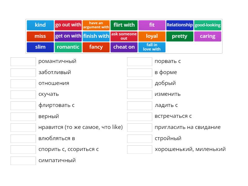 Relationship - отношения , ask someone out - пригласить на свидание , go out with - встречаться с, get on with - ладить с , fall in love with - влюбляться в , finish with - порвать с , cheat on - изменить , flirt with - флиртовать с , miss - скучать , have an argument with - спорить с, ссориться с , fancy - нравится (то же самое, что like) , good-looking - симпатичный , loyal - верный, pretty - хорошенький, миленький, romantic - романтичный , kind - добрый , fit - в форме , caring - заботливый , slim - стройный,