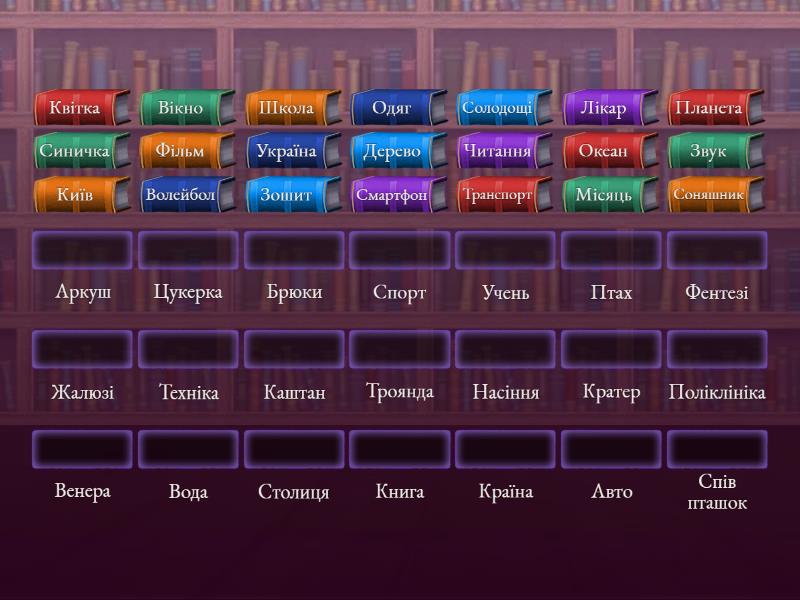 Звук - Спів пташок, Дерево - Каштан, Океан - Вода, Соняшник - Насіння, Місяць - Кратер, Фільм - Фентезі, Читання - Книга, Транспорт - Авто, Лікар - Поліклініка, Одяг - Брюки, Планета - Венера, Смартфон - Техніка, Синичка - Птах, Зошит - Аркуш, Вікно - Жалюзі, Квітка - Троянда, Солодощі - Цукерка, Волейбол - Спорт, Школа - Учень, Київ - Столиця, Україна - Країна,