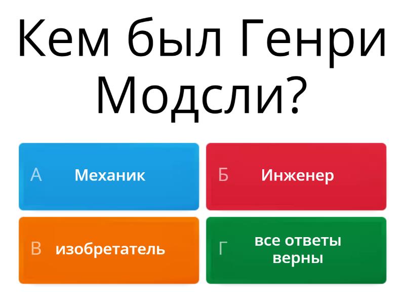 1) Кем был Генри Модсли? a) Механик b) Инженер c) изобретатель d) все ответы верны 2) В каком возрасте Генри устроился на работу? a) 12 лет b) 16 лет c) 18 лет d) 14 лет 3) Чем занимался на своей первой работе 12-летний Генри Модсли? a) Месил тесто b) Наполнял патроны порохом c) Продавал газеты d) Развозил молоко 4) Какую профессию решил освоить Модсли в возрасте 15 лет? a) Моряк b) Кузнец c) Плотник d) Мебельщик 5) В чьей мастерской Генри Модсли получил большие знания и ценный практический опыт в механике? a) Мастерская Джозефа Брама b) Мастерская Стивена Джонса c) Мастреская Питера Майна d) Мастерская Александра Стюарта 6) Чем занялся Модсли, когда покинул мастерскую Джозефа Брама? a) Устроился на завод b) Поступил в университет c) Открыл свою мастерскую d) отправился в США по обмену опытом 7) Какое изобретение Модсли совершило настоящий прорыв в промышленности? a) Шлифовальный станок b) Сварочный станок c) Токарно-винторезный станок d) Сверлильный станок 8) Что основал Генри Модсли, став состоятельным человеком? a) Машиностроительный завод b) Благотворительный фонд c) Премию в области механики d) Школу для талантливых детей 9) Какой наукой интересовался генри Модсли в последние годы жизни? a) Анотомия b) Астрономия c) Физика d) История