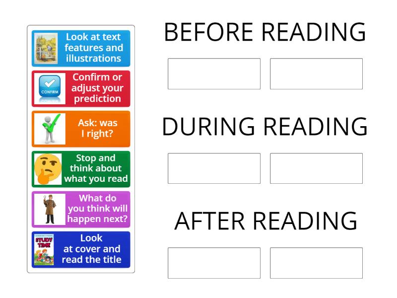 BEFORE READING: Look at cover and read the title, Look at text features and illustrations, DURING READING: Stop and think about what you read, What do you think will happen next?, AFTER READING: Confirm or adjust your prediction, Ask: was I right?,