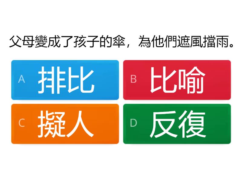 1) 父母變成了孩子的傘,為他們遮風擋雨。 a) 排比 b) 比喻 c) 擬人 d) 反復 2) 微風輕輕地從我的窗邊走過,還跟我打招呼。 a) 反復 b) 擬人 c) 比喻 d) 排比 3) 明亮的藍天,火紅的楓葉,金黃的稻田,原野間一片秋色。 a) 排比 b) 擬人 c) 比喻 d) 反復 4) 小草扶起來了,孩子高興地說:“媽媽,小草兒笑了,小草兒笑了! ” a) 擬人 b) 反復 c) 排比 d) 比喻 5) 寂寞時,音樂陪伴着我;煩惱時,音樂會鼓勵我;委屈時,音樂安慰了我。 a) 擬人 b) 反復 c) 排比 d) 比喻 6) 哈!哈!我終於考獲全班第一名了! a) 反復 b) 比喻 c) 排比 d) 擬人 7) 荷葉上一顆一顆的小露珠是一顆顆晶瑩的珍珠。 a) 比喻 b) 排比 c) 擬人 d) 反復 8) 火山突然發怒,一陣陣烏黑的濃煙從火山口中冒出。 a) 排比 b) 擬人 c) 反復 d) 比喻 9) 繁華的都市裏,街道像蜘蛛網般縱橫交錯。 a) 擬人 b) 反復 c) 排比 d) 比喻 10) 春天,邁著輕盈的腳步走來了,走來了。 a) 擬人 b) 排比 c) 比喻 d) 反復